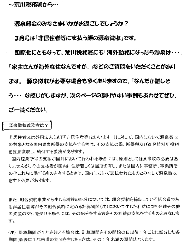 去る1月23日(木)荒川法人会館3階会議室において『源泉部会全体研修会』が実施されました。 当日は、酒井部会長、栗原源泉部会担当副会長、荒川税務署法人課税第2部門 田村統括官にご挨拶をいただいた後、「給与所得者の確定申告について」と題しまして荒川税務署個人課税第1部門 中田上席に講義をお願いいたしました。皆様の研修会へのご参加をお待ち申し上げております。
