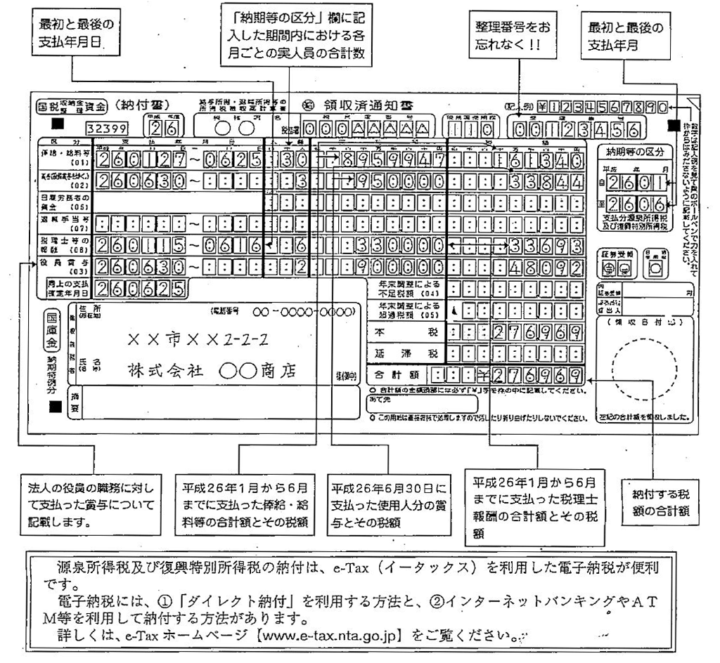 納付書には、納付する税額のほか、その月の給与等の支払を受ける人の数や給与等の支払額などを記載することになっています。