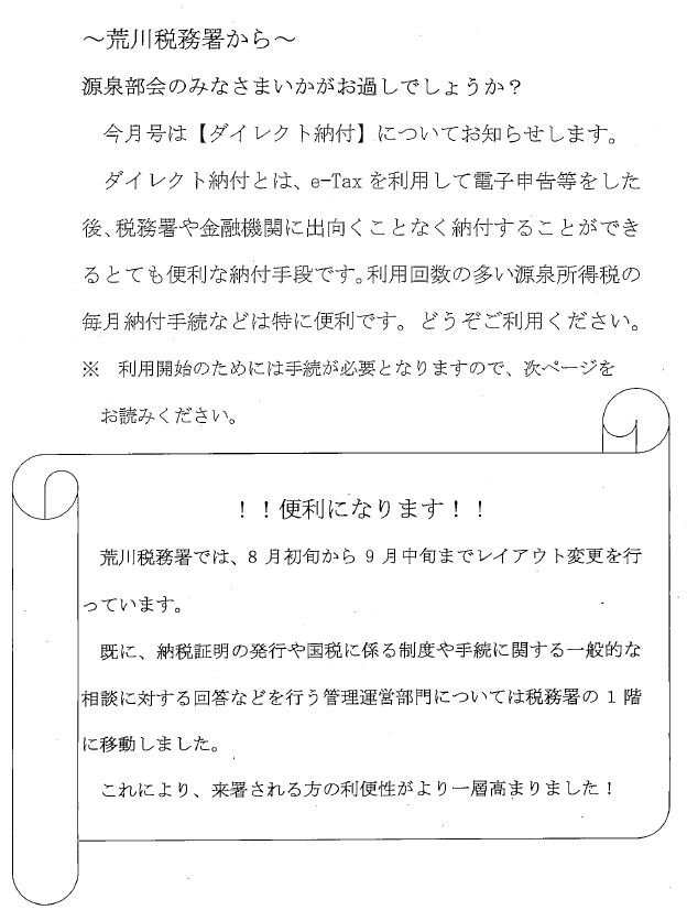 荒川税務署では、去る7月10日に定期人事異動がありました。 源泉部会の担当としてお世話になりました田村統括官は練馬東署 法人第5部門へ異動されました。新しい源泉部会担当として三平統括官、が着任されました。なお、坂井上席は留任されました。 今年度もよろしくお願いいたします。