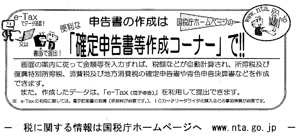 その他、期限内申告に係る所得税及び復興特別所得税については、指定した金融機関の口座から自動的に納税額が引き落とされる振替納税が利用できます。大変便利ですので是非ご利用ください。 |