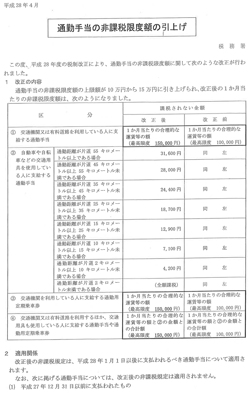 平成28年3月31日に所得税法施行令等の一部を改正する政令(平成28年政令145号)が公布され、通勤手当の非課税限度額が月額15万円(改正前:月額10万円)に引き上げられました。
