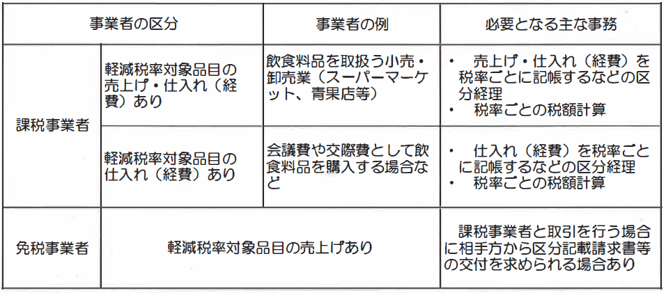 軽減税率制度の実施により、 事業者の方は、 日々の業務において、 税率の異なるごとに売上げや仕入れ(経費)を区分経理した上で、 申告・納税を行うことが必要となります。