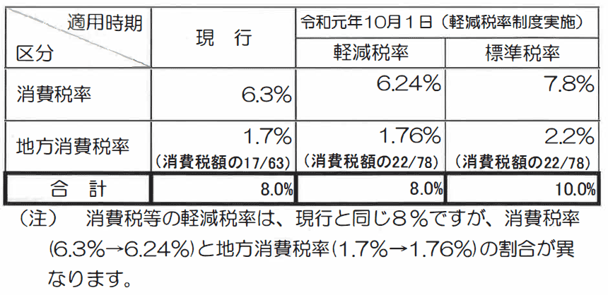 軽減税率制度の実施に伴い、令和元年10月1日からの消費税等の税率は、以下のとおり、 軽減税率(8%)と標準税率(10%)の複数税率となります。
