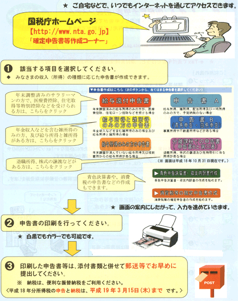 申告書はご自分で記入(又は、国税庁ホームページより作成)し、税務署へご提出ください。
