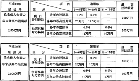 居住者が平成19年1月1日から平成20年12月31日までの間に住宅を自己の居住の用に供した場合、次の表のとおりの控除率及び適用年(控除期間)による特例(以下「税源移譲対応特例」といいます。)が、現行特別控除との選択により適用されることとなりました。