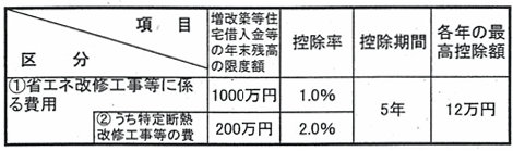 居住者が、その人の所有する居住の用に供する家屋について、断熱改修工事等(注1)又は特定断熱改修工事等(注2)を含む増改築等(以下「省エネ改修工事等」といいます。省エネ改修工事等に要した費用の額が30万円を超える増改築等に限ります。)をして、平成20年4月1日から平成25年12月31日までの間にその家屋をその人の居住の用に供した場合において、その人がその住宅の増改築等のための一定の借入金又は債務(以下「増改築等住宅借入金等」といいます。)を有するときは、増改築等に係る住宅借入金等特別控除(本則)又は控除額の特例との選択により、その居住の用に供した日の属する年(以下「居住年」といいます。)以後5年間の各年にわたり、増改築等住宅借入金等の年末残高の1,000万円以下の部分の金額を基として、次に掲げる控除率により計算した金額が省エネ改修工事等に係る特定増改築等住宅借入金等特別控除としてその人のその年分の所得税の額から控除されます。