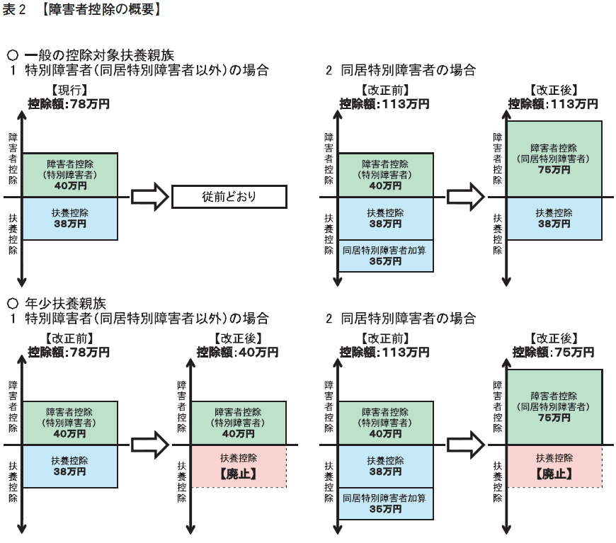 年少扶養親族に対する扶養控除が廃止されたことに伴い、控除対象配偶者又は扶養親族が同居特別障害者である場合に、配偶者控除又は扶養控除の額に35万円を加算する措置は、同居特別障害者に対する障害者控除の額を1人につき75万円(特別障害者である場合の障害者控除額40万円に35万円を加算した額)とする制度に改められました(下記表2参照)。 |