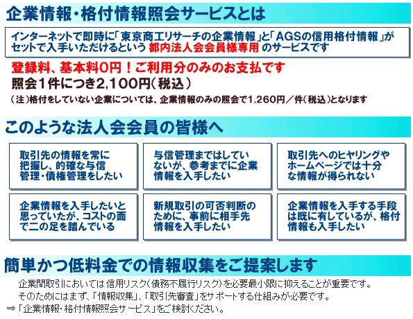 ※詳しい内容は、荒川法人会ホームページの「企業情報・格付け情報照会サービス」コーナーに掲載しておりますので、ご覧になってください。 また、利用登録も荒川法人会ホームページから登録できます。 荒川法人会ホームページアドレス(http://www.jah.ne.jp/~ara-hou/)