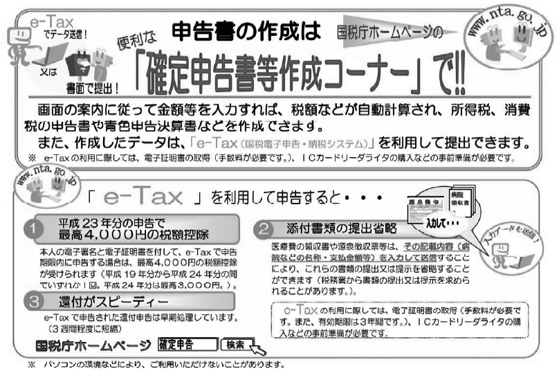 平成23年分の所得税の確定申告の相談及び申告書の受付は、平成24年2月16日(木)から同年3月15日(木)までです。還付申告については、平成24年2月15日以前でも相談及び申告書の受付を行っています。 |