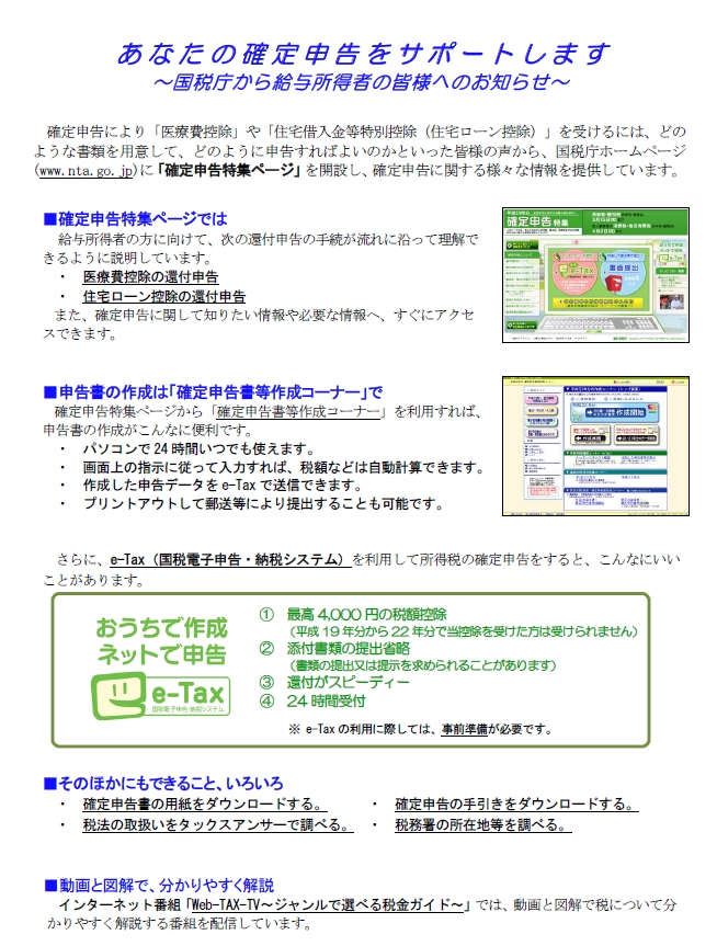 ※ 給与所得の収入金額の合計額から、所得控除の合計額(雑損控除、医療費控除、寄附金控除及び基礎控除を除く)を差し引いた残りの金額が150万円以下で、さらに各種の所得金額(給与所得、退職所得を除く)の合計額が20万円以下の方は、申告は不要です。 |