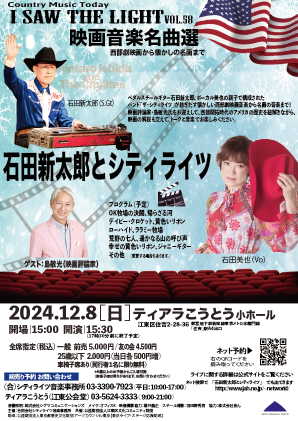 今回58回目、そして来年5月の59回目はアメリカのルーツを探ります。アメリカの先住民、渡ってきた移⺠、⾃らの意思ではなく連れてこられた奴隷といった様々な人種のるつぼと、彼らがアメリカに渡ってきた時に持ち込んだ楽器、それら全てが合わさって⽣まれてきた音楽的背景と楽曲を皆さんに紹介したいと思います。58回目はアメリカの欠かすことができない西部開拓時代が元になった西部劇音楽です。「荒野の七人」は日本の「七人の侍」をベースに作られました。映画監督の黒澤明を伯父に持つ島敏光氏を迎えお話を伺い、歌と演奏をお届けしていきます。また、海外からアメリカに渡ってきた楽器、バンジョーやマンドリン、ペダルスチールギターも用いて、楽器の特性やその時代ならではのサウンドをお聞かせします!映画音楽を深掘りしていく1部、2部とシティライツのサウンド、西部劇の音楽とお楽しみください。
